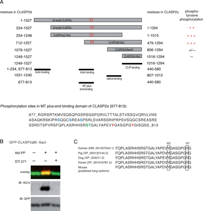 Abelson phosphorylation of CLASP2 modulates its association with microtubules and actin.
