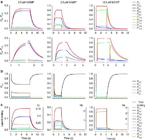 Figure 4. Time-dependent state population in the C4L-*O4L model.Using the parameters given in Fig. 3a, the population of all states in the C4L-*O4L model was computed for three fcGMP concentrations. (a) Upper time courses: open probability, Po (red curve, same curves as in Fig. 3b) and probability of being either in Ox, PO,x (x=0….3) or *Ox, P*O,x (x=0….4; coloured curves). The PO,x and P*O,x values sum up to Po. Lower time courses: part of the respective upper time courses at an expanded timescale. (b) Probability of being in the closed state x, PC,x (x=0….4). The PO,x, P*O,x, and PC,x, values sum up to unity. (c) Ligand binding to the total channel (red curve) to the individual open (x/4 × PO,x; x/4 × P*O,x; coloured continuous) and closed states (x/4 × PC,x; coloured dashed), given as fraction of unity (left ordinates). x/4 weighs the contribution of each liganded state to the total liganding. NL indicates the number of ligands bound to the channel and to the individual states under the assumption that maximally four ligands can bind to the channel (right ordinate).