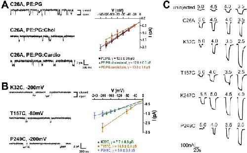 Figure 2. Purified GLIC reconstituted into liposomes is functional.(A) Single-channel currents of purified GLIC C26A mutant protein reconstituted into PE∶PG, PE∶PG∶cholesterol, and PE∶PG∶cardiolipin liposomes were recorded in planar lipid bilayers composed of the same lipids. Representative single-channel current traces (left), and current-voltage relationships with single-channel conductance values (right) are shown. Open-dwell times τo for the GLIC C26A mutant were 11.83±0.06 ms when reconstituted into PE∶PG liposomes, 10.15±0.08 ms into PE∶PG∶cholesterol liposomes, and 19.64±0.06 ms into PE∶PG∶cardiolipin liposomes, respectively. (B) Single-channel currents of purified GLIC mutants (K32C, T157C, and P249C) reconstituted into PE∶PG liposomes were recorded in planar lipid bilayers composed of the same lipids. Representative single-channel current traces (left) and current-voltage relationships with single-channel conductance values (right) are shown. (C) Currents induced by pH jumps from uninjected Xenopus laevis oocytes and ooctyes injected with purified, single cysteine MTSL-labeled GLIC protein reconstituted into PE∶PG liposomes (C26A, K32C, T157C, K247C, and P249C). Currents from GLIC-protein injected oocytes were significantly larger than those from uninjected oocytes.