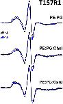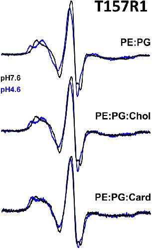 Figure 5. Effects of lipids on proton-induced gating motions.X-band CW EPR spectra of T157R1 reconstituted into PE∶PG (top), PE∶PG∶cholesterol (middle), and PE∶PG∶cardiolipin (bottom) liposomes at pH 7.6 (black, resting state) and pH 4.6 (blue, desensitized). Proton-induced changes in T157R1 mobility in the presence of cholesterol were indistinguishable from those of T157R1 reconstituted in PE∶PG, whereas cardiolipin hindered gating-induced changes in T157R1 mobility.