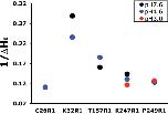 Figure 4. Proton-induced changes in spin probe mobility, ΔH0−1.For each GLIC mutant (C26R1, K32R1, T157R1, K247R1, and P249R1), the inverse width of the central line of the CW spectra, ΔH0−1, is plotted at pH 7.6 (black), pH 4.6 (blue), and pH 3.0 (red, K247R1 and P249R1 only). An increase in ΔH0−1 reflects increased R1 mobility, whereas a decrease reflects decreased mobility.