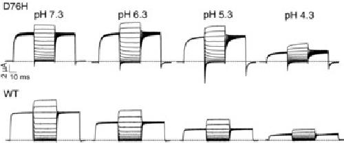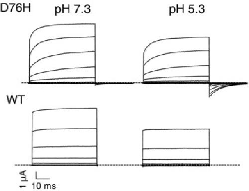 Figure 3. pH dependence of inward tail currentsRepresentative current recordings for D76H (upper traces) and WT ClC-5 (lower traces) at some of the pHext values tested (7.3, 6.3, 5.3, 4.3), obtained with a voltage protocol comprising a pre-pulse and a post-pulse to 100 mV. |
