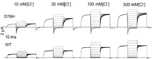 Figure 4. Chloride dependence of inward tail currentsRepresentative current recordings for D76H (upper traces) and WT ClC-5 (lower traces) at different [Cl−]ext (10, 30, 100 and 300 mm). pHext is 5.3. |
