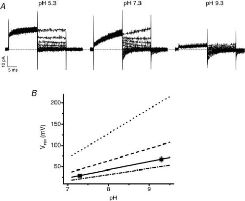 Figure 6. Dependence of the inward tail currents on pHintA, representative inward tail currents at the indicated pHint values (5.3, 7.3, 9.3) from three different oocytes. [Cl−]ext is 110 mm and pHext is 5.8. Currents shown are the average of five traces. B, mean values of the reversal potential at pHint 7.3 (n= 5) and 9.3 (n= 3). The full, dashed-dotted, dashed and dotted lines represent the theoretical expectation for the changes in the reversal potential for transporters with a 2 : 1, 3 : 1 or 1 : 1 Cl−/H+ stoichiometry or a pure proton conductance, respectively, derived from eqn (3). |