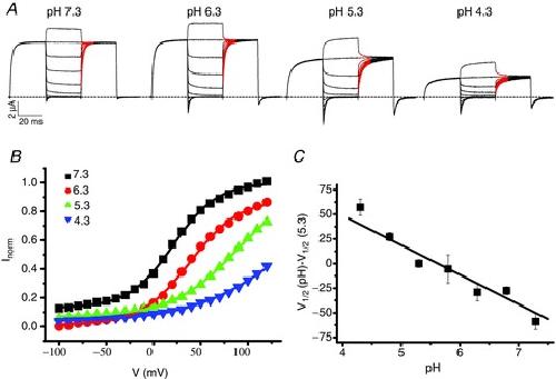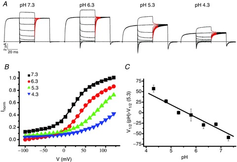 Figure 8. Voltage dependence of gating of D76H as a function of pHextA, representative current traces at the indicated pHext from one oocyte. Red lines represent the mono-exponential fit of the tail currents elicited by a post-pulse to 100 mV. The amplitude of the tail currents at the onset of the post-pulse was extrapolated from the fit. These values were normalized with the parameter Imax derived from the fit with eqn (1) to obtain the current–voltage (I–V) relationships. B, I–V relationships for the oocyte shown in A. Full lines are the fit of the data with a Boltzmann function (eqn (1)) providing estimates for V1/2 and z of 21, 39, 89, 141 mV and 1.1, 1.0, 0.8 and 0.5, respectively, for pH 7.3, 6.3, 5.3 and 4.3. C. mean values of the difference between V1/2 calculated at pH 4.3 (n= 6), 6.3 (n= 5), 7.3 (n= 7) and that calculated at pH 5.3 (n= 10) as a function of pHext. The full line represents the fit of the data with a linear function with a slope of 30.7 ± 6.4 per pH unit. |