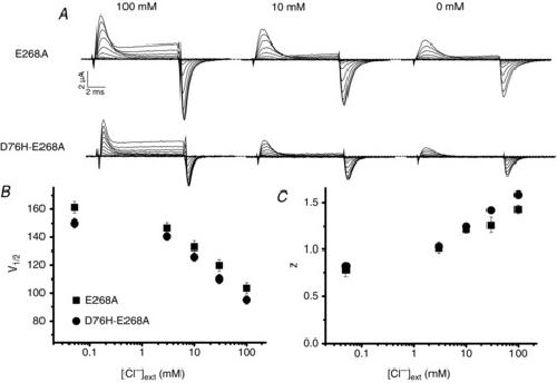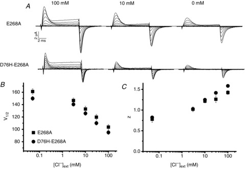 Figure 9. Comparison of the transient currents of E268A and D76H–E268A at different [Cl−]extA, representative current recordings from two oocytes, one expressing E268A (upper panel) and one expressing D76H–E268A (lower panel) at the indicated [Cl−]ext. B and C, average values for V1/2 and z, respectively, obtained from the Boltzmann fit of the Q–V relationship for [Cl−]ext of 0 mm (a contaminating concentration of 80 μm was assumed, see Zifarelli et al. 2012) (n= 6), 3 mm (n= 7), 10 mm (n= 6), 30 mm (n= 7) and 100 mm (n= 6) (eqn (3) and Supplemental material). |