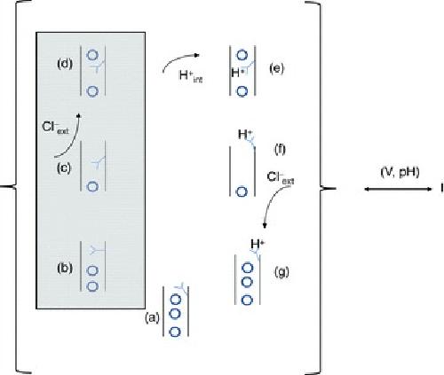 Figure 10. Schematic model of the transport cycle of ClC-5 including a gating mechanismThe hypothetical model is based on the transport cycle suggested for ClC-Cm by Feng et al. (2010) with the addition of state (c). The model is not intended to provide a realistic description of the ClC-5 transport cycle, but rather to guide a mechanistic interpretation of the results. Circles represent Cl− ions; the shaded box represents the branch of the transport cycle that is accessible to the E268A mutant. From any of the states composing the transport cycle, indicated collectively by a brace, ClC-5 can transition to the inactive state I in which it is not able to transport. Forward and backward transitions to state I are voltage and pH dependent. In state (a), the side chain of E211 is unprotonated and the transporter has all the binding sites occupied by Cl− ions. In state (b), the side chain of E211 moves to occupy Sext and one Cl− ion moves intracellularly. In state (c), the side chain of E211 moves to occupy Scen and this is associated with the transport of another Cl− ion, whereas Sext is transiently empty but binds an extracellular Cl− ion in state (d). From this conformation E211 can be protonated by an intracellular proton (state e) and can move outwardly (state f), giving way to Cl− binding from the extracellular space (state g). |