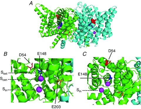 Figure 1. Location of the residue D76 mapped on the structure of ClC-ec1 (PDB entry: 1OTS)A, dimeric structure of ClC-ec1 viewed from the membrane plane (extracellular side above and cytoplasmic side below). The two subunits are shown in green and cyan. Residue E148 (corresponding to E211 in ClC-5) is coloured in blue, D54 (corresponding to D76 of ClC-5) is shown in red and E203 (corresponding to E268 of ClC-5) in orange. Cl− anions bound to Scen and Sint are shown in magenta. B, expanded representation of the anion permeation pathway for one of the subunits. The position of the three binding sites, Sext, Scen and Sint, is also indicated by horizontal dashed lines. C, same representation as in B with a top view perpendicular to the membrane. In B and C, some transmembrane helices were removed for clarity. |