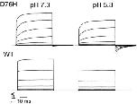 Figure 2. pH dependence of D76H and WTRepresentative current recordings for D76H (upper traces) and WT ClC-5 (lower traces) at pH 7.3 and 5.3. Voltages of the test pulse ranged from 120 to –80 mV. Here and in all figures with current traces, the dashed line represents the zero current level. |