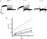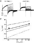 Figure 7. Dependence of the inward tail currents on [Cl−]intA, representative inward tail currents at the indicated [Cl−]int (104 and 21 mm). [Cl−]ext is 110 mm and pHext is 5.8. Currents shown are the average of five traces. B, mean values of the reversal potential at [Cl−]int = 104 (n= 5) and 21 mm (n= 4). The full, dashed-dotted, dashed and dotted lines represent the theoretical expectation for the changes in the reversal potential for transporters with a 2 : 1, 3 : 1 or 1 : 1 Cl−/H+ stoichiometry or a pure proton conductance, respectively, derived from eqn (3). Error bars are smaller than symbols. |
