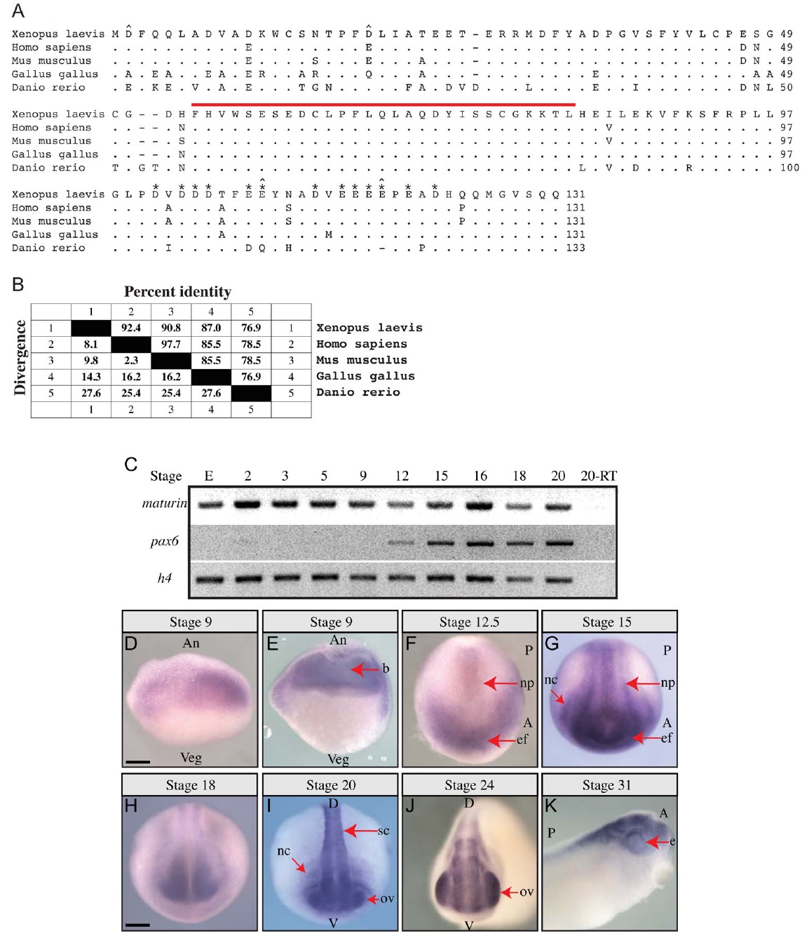 Fig. 1. Maturin predicted protein sequence, conservation and expression during Xenopus laevis embryonic development. (A) Maturin protein sequence alignment. Predicted amino acid sequence of X. laevis Maturin aligned with putative orthologs from other vertebrates. Periods indicate amino acid identity, while gaps (dashes) were inserted to optimize the alignment. The 29-residue Maturin Motif is indicated by a red over-line. Aspartic (D) and glutamic (E) amino acids in the acidic domain are labeled with asterisks. The four positions at which nonconservative changes of highly acidic amino acids have taken place are indicated with a caret (^). (B) Amino acid identity among vertebrate Maturins. Percent identity shared with X. laevis Maturin is shown. Genbank accession numbers are: X. laevis BC045253, H. sapiens NM_152793 (C7orf41), M. musculus BC042507 (2410066E13Rik), G. gallus XM_003640720.1, D. rerio NM_001144806. (C) Detection of maturin and pax6 transcripts using RT-PCR. Gene specific primers were used to detect maturin and pax6 transcripts in total RNA isolated from eggs (E) and whole embryos of the indicated developmental stage. Histone h4 was used as a loading control. (DâK) Maturin expression in developing embryos. Whole mount in situ hybridization was used to detect Xenopus laevis maturin expression. Developmental stage is indicated above each panel. (E) Stage 9 embryo cut open with a razor following whole mount in situ hybridization. An, animal; Veg, vegetal; b, blastocoel; A, anterior; P, posterior; np, neural plate; ef, eye field; nc, neural crest; D, dorsal; V, ventral; sc, spinal cord; ov, optic vesicle; e, eye. Scale bars = 400μm. |