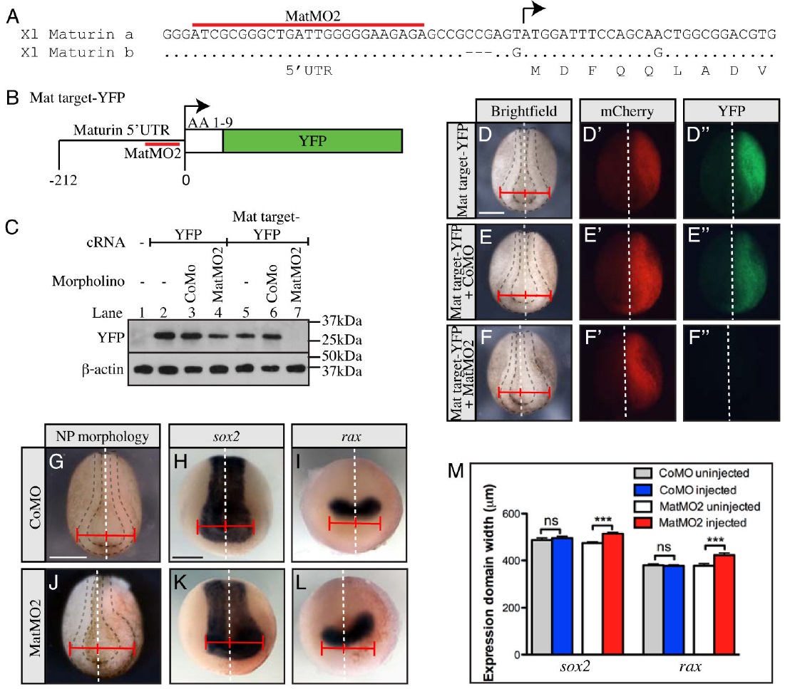 Fig. 3. Maturin knockdown results in neural plate expansion. (A–F″) Design and test of Maturin morpholino activity. (A) Sequence alignment of a and b homeologs of X. laevis maturin showing relative position of the Maturin morpholino MatMO2 (red overline). (B) Schematic of the Mat target-YFP reporter construct used to test morpholino activity. (C) Western blots were used to detect the expression of YFP and β-actin (loading control) in extracts prepared from embryos injected with the indicated morpholino, and cRNA coding for YFP or Mat target-YFP. (D–F″) Brightfield (D, E and F), mCherry fluorescent (D′, E′ and F′) and YFP fluorescent (D″, E″ and F″) images of stage 15 embryos unilaterally injected with cRNA for mCherry and Mat target-YFP alone (D – D″), with CoMO (E–E″), or MatMO2 (F–F″). (G– M) Neural plate expansion following Maturin knockdown. The extent of neural plate expansion was determined by comparing the distance between the embryonic midline (white dashed line) and outer edge of the neural ridge on the control (uninjected) and injected side of embryos injected with CoMO (G–I) or MatMO2 (J–L). In situ hybridization for sox2 (H, K) and rax (I, L) was used to more precisely quantitate the extent of neural plate expansion (M). Graph shows the size of the sox2 and rax expression domains in the uninjected and injected side of either CoMO or MatMO2 embryos. Error bars show the s.e.m. Asterisks indicate P-values calculated using a one-way ANOVA analysis (ns P>0.05; *** P<0.0001). Right side (viewer’s perspective) of all embryos is the injected side. Scale bars, 400μm. |