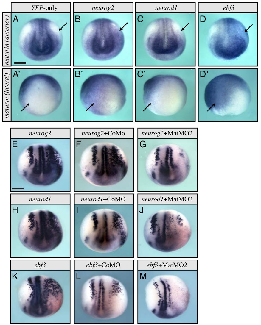 Fig. 6. Maturin transcription is induced by, and Maturin function is required for the activity of, the proneural transcription factors. (A–D′) Anterior (A–D) and lateral (A′–D′) views of maturin expression in embryos misexpressing YFP-only (A, A′), neurog2 (B, B′), neurod1 (C, C′), and ebf3 (D, D′), respectively. Arrows show areas normally lacking maturin (A, A′), express ectopic maturin when proneural transcription factors are misexpressed (B–D′). (E–M) One blastomere of 2-cell staged embryos were injected with the indicated proneural transcription factor alone (E, H and K), with control (F, I and L) or Maturin (G, J and M) morpholinos. The effects on tubb2b expression were detected by whole mount in situ hybridization at stage 15. Right side (viewer’s perspective) is the injected side. Scale bar, 400μm. |