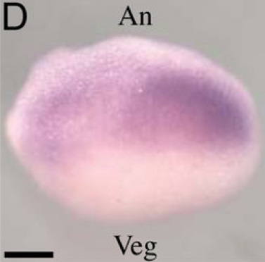 mturn (maturin, neural progenitor differentiation regulator homolog) gene expression in Xenopus laevis embryo, assayed via in situ hybridization, NF stage 9, horizontal view, animal up. |