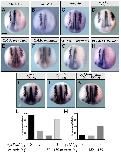 Fig. 5. Maturin knockdown inhibits differentiation of neural progenitors. (A–C) Whole mount in situ hybridization for tubb2b following Maturin knockdown. tubb2b expression in CoMO injected (A), uninjected (B), or MatMO2 injected embryos (C). A similar effect on tubb2b expression was also observed with MatMO1 (Fig. S1G). (D–F) Proliferation in Morpholinoinjected embryos. Proliferating cells were labeled using pHH3 whole mount immunostaining in CoMO (D) and MatMO2 injected embryos (E). Insets in D and E show the 0.138 mm2 area on the control and injected side of each embryo in which pHH3-positive cells were counted to generate the results (F). (G–I) Whole mount in situ hybridization for tubb2b after maturin overexpression. tubb2b expression in β-Gal (G) and maturin cRNA (H) injected embryos. In all panels of this figure, the injected side is to the right (viewer’s perspective). The s.e.m. is shown. P-values obtained using Student’s t-test: **P=0.0023. Scale bars, 400μm. |