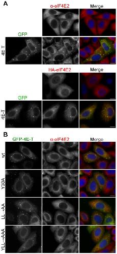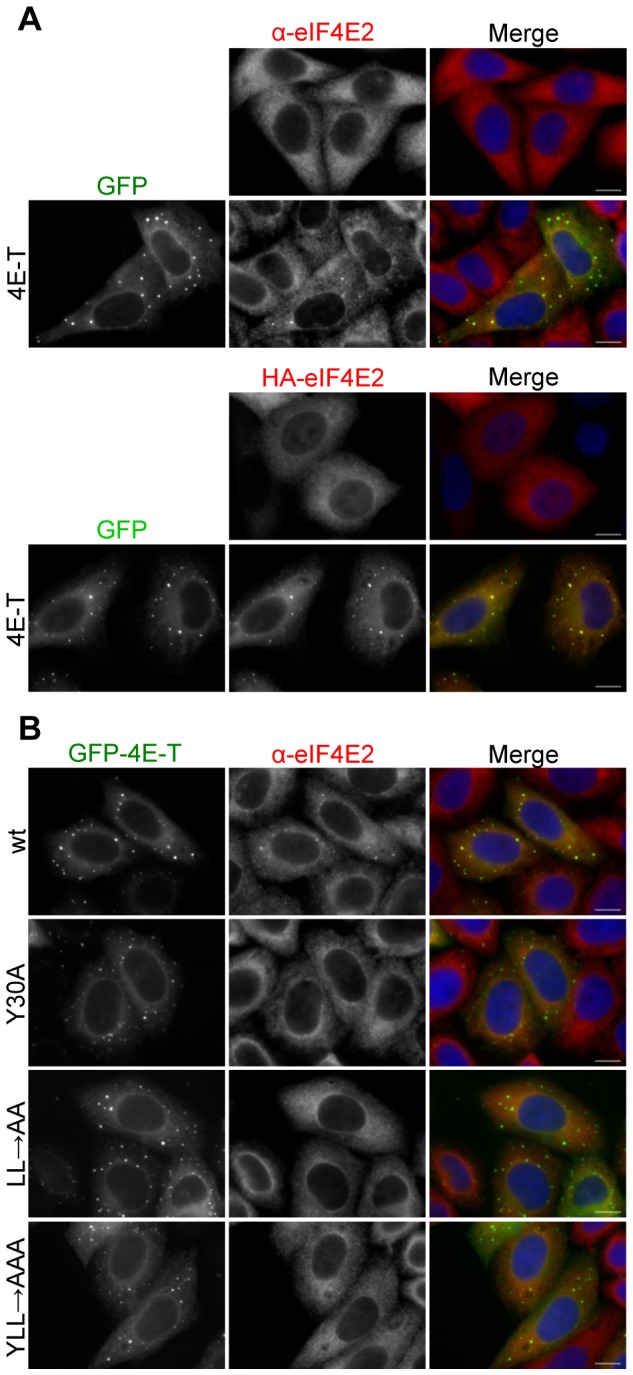 Figure 2. eIF4E2 is recruited to P-bodies by ectopic 4E-T.A. Cellular eIF4E2 distribution in HeLa cells was assessed by indirect immunofluorescence in the absence and presence of GFP-4E-T, and similarly for HA-tagged eIF4E2 co-transfected or not with GFP-4E-T. B. Wild-type but not mutant GFP-4E-T recruits eIF4E2 to P-bodies. Mutations in the 4E-T eIF4E-binding site residues Y30X4LL to alanine are indicated. Cells were also stained with DAPI. Scale bar, 10 µm.