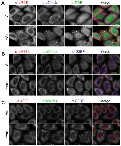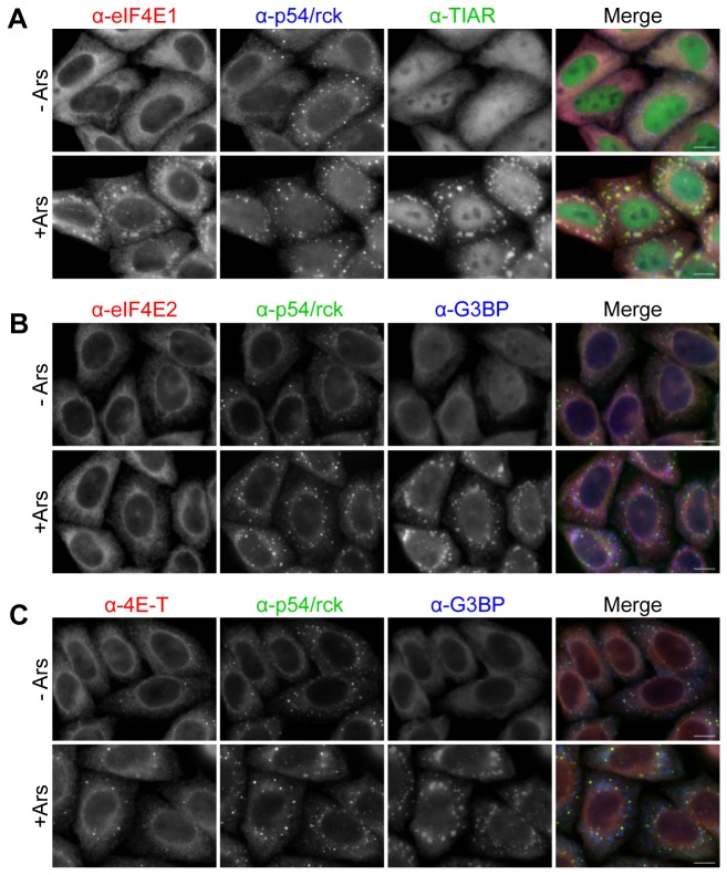 Figure 4. eIF4E1 and eIF4E2 distribution in arsenite-treated cells.Control HeLa cells (- Ars) and cells treated with arsenite (+ Ars) to induce stress granules were immunostained with eIF4E1 (A), eIF4E2 (B) and 4E-T (C) antibodies, and counter-stained with antibodies against p54/rck (P-body marker), and TIAR or G3BP (stress granule markers) as indicated. Scale bar, 10 µm.