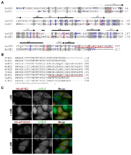 Figure 8. The leucine-rich C-terminus of eIF4E2 does not act as a NES.A. Sequence alignment of human eIF4E1 and eIF4E2 performed with ClustalW2. Secondary structural elements of α-helices (H0-H4) and β-strands (S1-S7) were shown above the alignment according to the crystal structure of human eIF4E2 in complex with m7 GTP (PDB id: 2JGB) [15]. Identities are shaded in grey. With blue and red are marked hydrophobic residues that typically form the NES. The leucine-rich C-terminus of eIF4E2 is underlined in red. B. ClustalW alignment of the C-terminal regions of indicated eIF4E2 proteins. C. HeLa cells transfected with HA-eIF4E2 full-length protein or HA-eIF4E2ΔC (truncated at residue 222) were treated with LMB or methanol (-) for 5 hrs and immunostained with HA and 4E-T antibodies as indicated. Cells were also stained with DAPI. Scale bar, 10 µm.