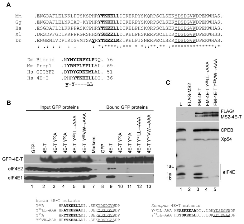 Figure 3. The eIF4E-binding site in 4E-T.A. Top. The sequences of the eIF4E2-binding site in Dm Bicoid [17], Mm Prep1 [18], Hs GIGYF2 [19] and Hs 4E-T ( [20]. Bottom. Alignments of five indicated vertebrate 4E-T sequences using ClustalW2. In bold are indicated the eIF4E-binding site residues, note the upstream tyrosine in Dr 4ET, bold and underlined. Underlined are the residues of a potential conserved second eIF4E-binding site. B. HEK293 cells were transfected with wild type or mutant GFP-4E-T as indicated and lysates were analysed by GFP-Trap and western blotting with eIF4E1, eIF4E2 and 4E-T antibodies. C. mRNAs encoding FLAG-MS2 and FLAG-MS2-X4E-T proteins were injected into Xenopus oocytes. After 16 hours, lysates were prepared and immunoprecipitated with FLAG antibodies, and the FLAG peptide eluates were analysed by western blotting with indicated antibodies. L lane indicates uninjected oocyte lysate. The mutations in human and Xenopus 4E-T sequences are indicated in B and C.