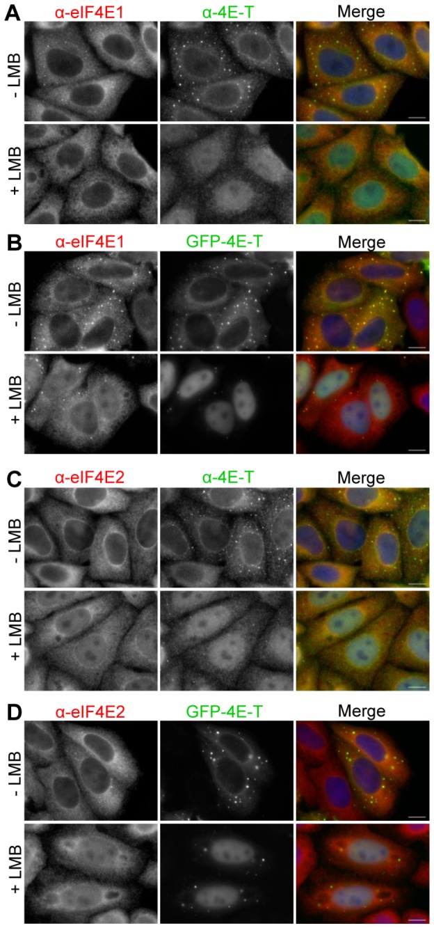 Figure 6. eIF4E2 is a nucleocytoplasmic shuttling protein.Hela cells were treated with Leptomycin B for 5 hrs (+ LMB) or with methanol as control (- LMB), without (A and C) and with ectopic GFP-4E-T (B and D), and immunostained with eIF4E1 (A and B), eIF4E2 (C and D) and 4E-T antibodies, while GFP-4E-T fluorescence was detected directly in transfected cells. Scale bar, 10 µm.
