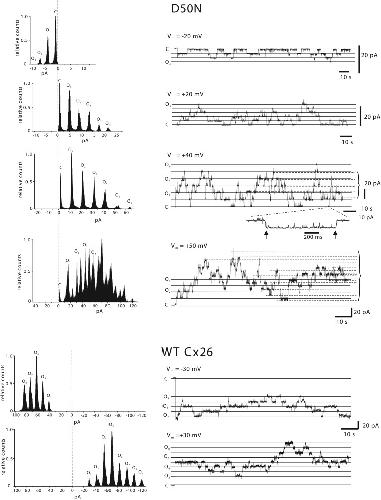 Figure 5. Single hemichannel recordings demonstrate that D50N affects loop gating. Multichannel cell-attached patch recordings of D50N and Cx26 WT hemichannels are shown. The patch pipette and bath solutions consisted of IPS. For the D50N, shown are 2–3-min consecutive segments of current recorded at membrane potentials of −20, 20, 40, and 50 mV. The solid lines designated C represent the leak conductance of the patch when no hemichannels were open. Solid lines designated On represent current levels of single or multiple fully open hemichannels. Dashed lines represent intermediate conductances (substates). All point histograms obtained from these recordings are shown to the left of each trace. At voltages of −20, 20, and 40 mV, gating events are uniform in size and represent transitions between closed and fully open hemichannels. The inset below the 40 mV trace shows an open and closing transition at an expanded time scale that is characteristic of loop gating. At 50 mV, many subconducting transitions become evident and are consistent with the onset of Vj or fast gating. Note that D50N hemichannels exhibit substantial closure even at −20 mV as expected because of the shift in loop gating caused by the mutation. For the Cx26 WT hemichannel, the currents shown were recorded at −30 mV and 30 mV. Note that open probability for WT Cx26 is similar at both voltages. All currents were filtered at 1 kHz, and data were acquired at 5 kHz. |