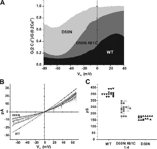 Figure 8. K61C functions as a heteromer and confers Ca2+ regulation. (A) Plots showing mean ratios of the macroscopic conductances measured in 2 and 0.2 mM Ca2+, G2Ca2+/G0.2Ca2+, over voltage range from −80 and 40 mV. G-V curves were obtained in oocytes injected with mRNA for WT Cx26, D50N mutant, and a 1:4 mixture of D50N:K61C. Oocytes injected with K61C alone did not exhibit measureable currents (not depicted). (B) Examples of single hemichannel currents obtained from an oocyte expressing D50N:K61C in a 1:4 ratio (gray lines). Currents are in response to voltage ramps applied from 70 to −70 mV. Each trace represents a separate patch with selected examples of hemichannels with intermediate conductance and rectification properties. Representative I-V relations of open WT Cx26 and D50N hemichannels are displayed as dashed lines. (C) Values of unitary hemichannel conductance measured as the slope conductance at Vm = 0 for WT Cx26 (▾), D50N:K61C (gray circles), and D50N (▴). Values for D50N:K61C include those after exposure to MTSET (□) or MTSES (○). Each point represents data from a separate patch. WT Cx26 and D50N hemichannels each clustered tightly about their mean values, whereas D50N:K61C was spread out over a wider range, indicative of hemichannels with different conductances. |