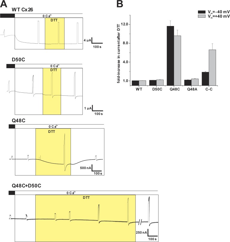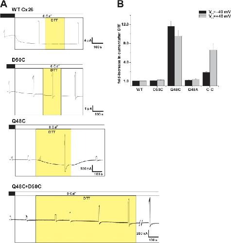 Figure 10. Effects of DTT on Cys-substituted hemichannels. (A) Representative records of membrane currents in oocytes voltage clamped at â40 mV. Voltage was occasionally stepped to 40 mV for 10 s to test for hemichannel activation. Application of 1 mM DTT (yellow) produced a large increase in current in oocytes expressing Q48C and the double mutant D50C + Q48C (bottom two panels). The effect of DTT was readily reversible after wash-out only for Q48C. DTT had essentially no effect on WT and D50C hemichannels (top two panels). (B) Bar graph summarizing the effects of DTT on WT Cx26, D50C, Q48C, and Q48C + D50C (C-C). Ala substitution at Q48 is also included. For each oocyte, current magnitude was measured at â40 and 40 mV before and after DTT. Data are plotted as fold increase in current after DTT. n = 13 for WT Cx26, 11 for D50C, 14 for Q48C, 7 for Q48A, and 7 for D50C + Q48C. Error bars represent mean ± SE. |