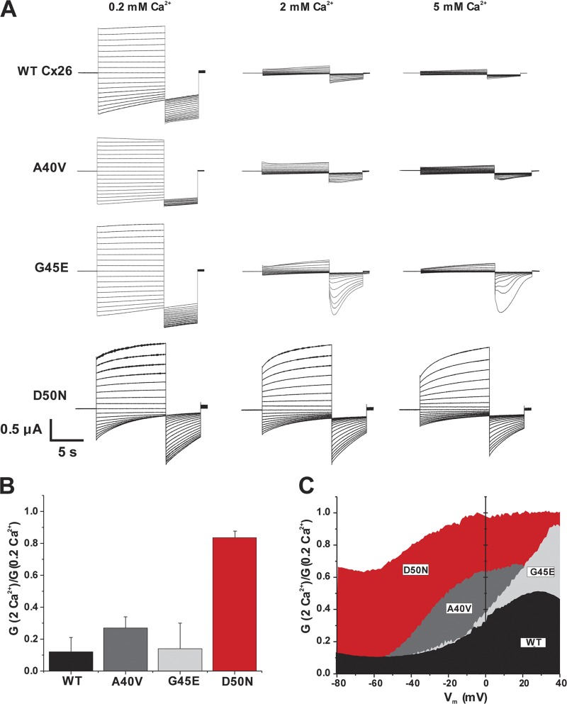 Figure 1. The D50N KID mutation exhibits substantially impaired regulation by extracellular Ca2+ over a wide voltage range. (A) Representative hemichannel currents in Xenopus oocytes obtained using a voltage step protocol that consisted of 10-s steps, from 60 to â110 mV in intervals of 10 mV, followed by a 5-s step to â110 mV. Oocytes were voltage clamped to â20 mV between steps. Currents shown in each case are from single oocytes exposed to all three Ca2+ concentrations. WT Cx26, A40V, and G45E all showed substantial reductions in current magnitude at the higher Ca2+ concentrations, whereas D50N was nearly insensitive. (B) Bar graph showing ratios of the values of the macroscopic conductances measured in 2 and 0.2 mM Ca2+, G2Ca2+/G0.2Ca2+. The conductances were calculated from currents elicited by brief (1 s) voltage steps of ±10 and 20 mV from a holding potential of â20 mV. D50N exhibits near insensitivity to Ca2+. Each bar represents the mean ratio ± SE. n = 12 for WT Cx26, 8 for A40V, 12 for G45E, and 10 for D50N. (C) Plots showing mean ratios of macroscopic conductances measured in 2 and 0.2 mM Ca2+, G2Ca2+/G0.2Ca2+, over a voltage range of â80 to 40 mV. G-V curves were obtained from voltage ramps applied from 40 to â100 mV, 600 s in duration. Oocytes were held at a holding potential of â20 mV. Before initiating the ramps, oocytes were stepped to 40 mV for 30 s to allow conductance to reach steady-state. Ca2+ regulation shows some voltage dependence, with more effective inhibition of currents at large negative membrane potentials. D50N shows poor Ca2+ regulation over the entire voltage range. |