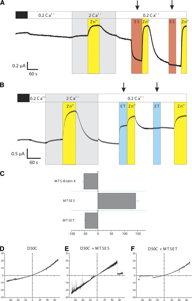Figure 3. SCAM experiments using MTS reagents indicate D50 is a pore-lining residue. (A and B) Shown are effects of MTSES (A) and MTSET (B) on macroscopic D50C hemichannel currents. Oocytes were held at â40 mV throughout. Oocytes were exposed to 100 mM NaCl salt solutions with Ca2+ concentrations as indicated in the top bar; black segments indicate oocytes were initially bathed in MND96. Because of the poor sensitivity to Ca2+, 200 µM Zn2+ (yellow segments) was used to periodically close D50C hemichannels. Application of 2 mM MTSES and 0.2 mM MTSET is indicated by arrows above the orange and blue segments, respectively. (C) Summary of the percent change in current (mean ± SE) after application of each reagent. n = 43 for MTSES, 18 for MTSET, and 4 for MTS-biotin X. (DâF) Representative examples of patch-clamp recordings obtained from cell-attached patches containing single D50C hemichannels recorded from oocytes that were not exposed to MTS reagents (D), were exposed to 2 mM MTSES (E), and were exposed to 0.2 mM MTSET (F). All unitary currents were obtained in response to 8-s voltage ramps between ±70 mV and leak subtracted. Bath and pipette solutions consisted of IPS. |