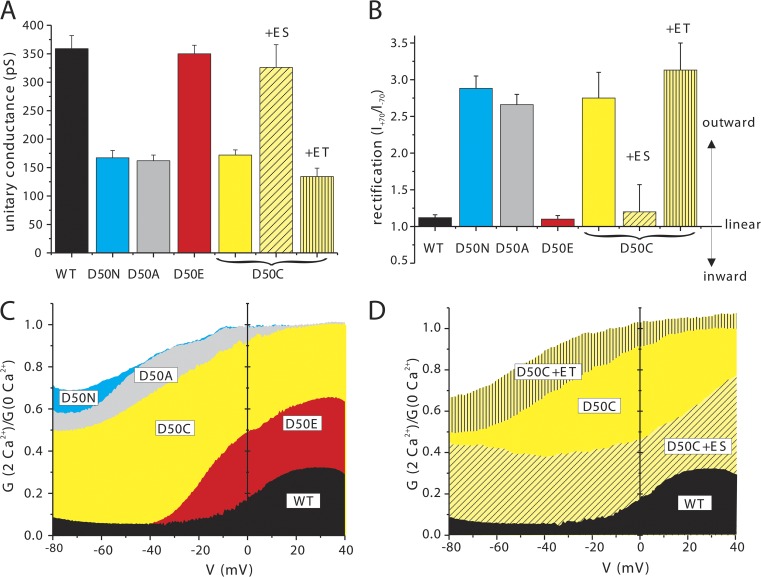 Figure 6. The presence of a negative charge at position 50 confers WT open hemichannel properties but a variable degree of Ca2+ regulation. (A and B) Values of unitary conductance (A) and open hemichannel rectification (B) for WT Cx26 and several D50 mutant hemichannels. Each bar represents the mean value ± SD; n = 18 for WT Cx26, 16 for D50N, 14 for D50A, 10 for D50E, 11 for D50C, 8 for D50C + MTSES, and 12 for D50C + MTSET. Open hemichannel conductance was measured as the slope conductance at Vm = 0. Rectification was measured as the ratio of the open hemichannel current at 70 and −70 mV. (C and D) Plots showing mean ratios of the macroscopic conductances measured in 2 and 0.2 mM Ca2+, G2Ca2+/G0.2Ca2+ over a voltage range of −80 to 40 mV. G-V curves were obtained from slow voltage ramps as described in Fig. 1 C. (C) Plots superimposing WT Cx26 and mutants with different substitutions at position 50. (D) Plots superimposing WT Cx26 and the D50C mutant, unmodified and modified with MTSET or MTSES. |