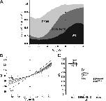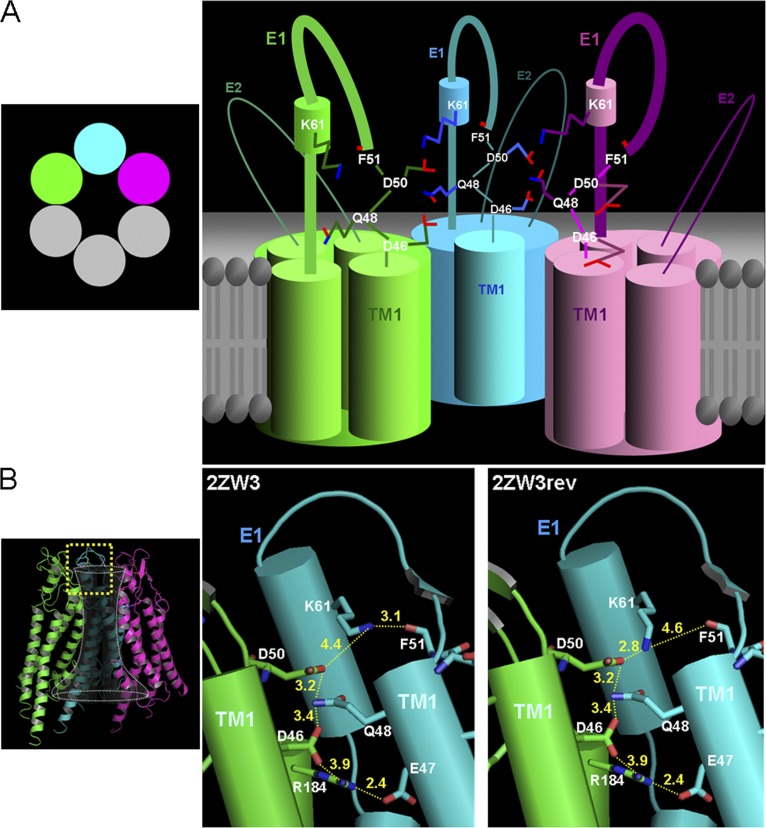 Figure 7. Possible intra- and intersubunit interactions at the border of TM1 and E1 of Cx26. (A) Illustration depicting three of six connexin subunits around a central aqueous pore. Each subunit is represented by a different color. Cylinders inside the subunits represent the transmembrane domains. TM1 denotes the first transmembrane domain that is exposed to the pore. E1 and E2 denote the first and second extracellular loop domains, respectively. D50 and D46 residues in E1 of each subunit are shown projecting into the pore. For the green (left) and cyan (middle) subunits, the D50 side chains come into proximity with K61 (situated on a short helix in E1) and Q48 (in E1) from the adjacent subunits. D46 also comes into close proximity to Q48. The illustration is not drawn to scale or strictly according to the atomic structure to emphasize the arrangement of interacting residues at the extracellular end of the pore. (B) Representation of the same three connexin subunits that constitute a Cx26 hemichannel viewed from the pore using the atomic structure published by Maeda et al. (2009). The superimposed cone in the left panel depicts the gross shape of the pore. The boxed region is shown in two expanded views to highlight the interacting residues between the green and cyan subunits. Only segments A39-R75 and C180-E187 are displayed in the expanded views for clarity. In the originally published structure (Protein Data Bank accession no. 2ZW3; middle), K61 in the cyan subunit is shown in close proximity to the backbone carbonyl of F51 in the same subunit. D50 and Q46 in the green subunit are in close proximity to Q48 from the adjacent (cyan) subunit. Other putative interactions shown are D46 with R184 in the same (green) subunit and R184 with D47 of next adjacent (cyan) subunit. Segments of E1 and TM1 are indicated. In the alternative structure (2ZW3rev; right) K61 in the cyan subunit is positioned in closer proximity to D50 in the adjacent (green) subunit. Structures were generated using PyMOL software. |