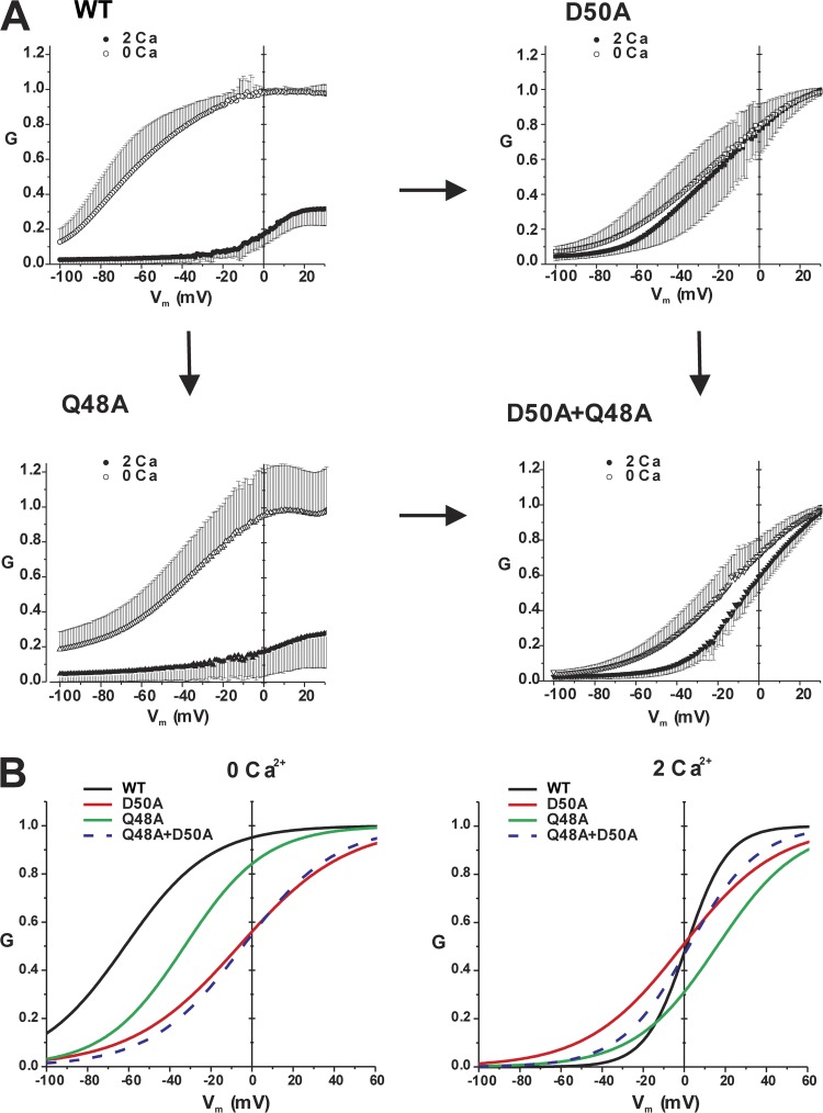 Figure 9. Mutant cycle analysis suggests that D50 and Q48 residues interact. (A) G-V relationships for WT Cx26, D50A, Q48A, and double mutant D50A + Q48A hemichannels at two different external Ca2+ concentrations, 0 (or nominal) and 2 mM. Data were obtained by applying slow (600 s) voltage ramps from 40 to −100 mV from a holding potential of −20 mV. For each oocyte, conductances at both Ca2+ concentrations were normalized to the maximum value in 0 mM Ca2+. n = 11 for WT Cx26, 17 for D50A, 14 for Q48A, and 6 for D50A + Q48A. The G-V curves are arranged as a mutant cycle where residues D50 and Q48 are mutated separately and together. The arrows connecting each pair of hemichannel phenotypes refer to mutation of either the D50 residue (horizontal arrows) or the Q48 residue (vertical arrows). The double D50A + Q48A mutant resembles D50A alone, suggestive of an interaction between D50 and Q48. (B) Fitted G-Vm relations normalized to their maximum conductance obtained by fitting data to a stochastic gating model developed for connexin channels (Paulauskas et al., 2009, 2012; see Materials and methods). These G-V curves represent voltage-dependent gating independent of rectification of open hemichannels. G-V curves for WT and mutant hemichannels are superimposed in 0 mM Ca2+ (left) and 2 mM Ca2+. Note the similarity of phenotypes displayed by D50A and double mutant D50A + Q48A in 0 and 2 mM Ca2+. |