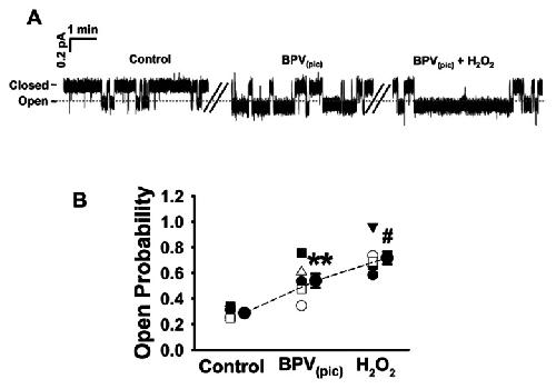Figure 6. Inhibition of PTEN leads to an aberrant activation of ENaC in A6 cells.Representative single-channel ENaC trace recorded from an A6 cell before and after addition of 30 nM BPV(pic) and 3 mM H2O2 to the basolateral bath. Two breaks between the traces indicate the 20 min omitted recording periods. (B) Summarized Po of ENaC before and post application of different reagents. n = 5 paired experiments. **P<0.01 compared with control group, #P<0.05 compared with BPV(pic) treatment group.