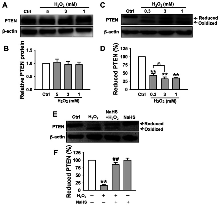 Figure 4. H2O2 oxidizes PTEN and H2S protects PTEN to be oxidized by H2O2.All experiments were assessed in the presence of 50 µM 2,2′-dipyridyl. (A) and (B) Western blot analysis demonstrates that the total PTEN protein expression was not altered by treatment of A6 cells with 1 mM, 3 mM and 5 mM H2O2. (C) and (D) Western blot analysis shows that the magnitude of reduced (active) PTEN was dramatically decreased upon treatment of A6 cells with 0.3 mM, 1 mM and 3 mM H2O2 for 30 min; the intensity of the bands corresponding to reduced PTEN in the top panels of (C) was determined and presented as a percentage of the sum of the intensities of the bands corresponding to the oxidized and reduced proteins. (E) and (F) show that H2S protected 3 mM H2O2 induced PTEN oxidation (n = 3 in each group) **P<0.01 compared with control group; P<0.05 compared with 0.3 mM H2O2 treatment group; ##P<0.01 compared with H2O2 treatment group.