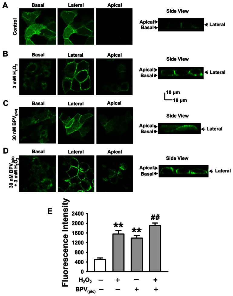 Figure 5. Inhibition of PTEN by BPV(pic) results in accumulation of PI(3,4,5)P3 near the apical compartment of A6 cells.The experiments were performed under different conditions as follows: (A) control; (B) the cells were treated with 3 mM H2O2 for 30 min; (C) the cells were treated with 30 nM BPV(pic) for 30 min; (D) the cells were co-treated with 30 nM BPV(pic) +3 mM for 30 min. (E) Summarized mean fluorescent intensities measured as ascribed in Figure 3 from three independent experiments, which represent the level of PI(3,4,5)P3 in the apical membrane. **P<0.01 compared with control group, ##P<0.01 compared with BPV(pic) treatment group.