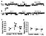 Figure 1. H2S inhibits H2O2-induced enhancement of ENaC activity in A6 cells.(A) and (B) Representative single-channel ENaC traces respectively recorded from two A6 cells before and after addition of 3 mM H2O2 and 3 mM H2O2+0.1 mM NaHS to the basolateral bath; the breaks between the traces indicate omitted 20 min of the recording periods; downward events represent channel openings (the dashed gray line); the currents were monitored for at least 30 min before and after chemical application for both in (A) and (B). (C) and (D) Summarized Po of ENaC before and after application of different reagents as indicated (n = 6 paired experiments). **P<0.01 compared with control group, ##