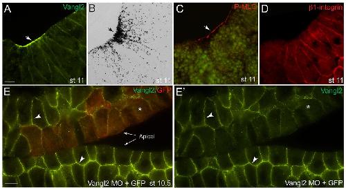 Fig. 1. Subcellular distribution of Vangl2 at the blastopore lip. (A-D) Parasagittal sections of stage (st) 11 embryos showing the blastopore area (arrows). (A) Immunohistochemical staining demonstrating apical and basolateral localization of endogenous Vangl2. (B) Bright-field view of a similar embryo section shows extensive pigmentation in the constricting blastopore cells. (C) Staining with antibodies against pMLC. (D) Basolateral localization of β1-integrin in bottle cells. (E,Eâ²) Subcellular distribution of Vangl2 in the superficial and the inner ectoderm cells. (E) Mosaic distribution of Vangl2 MO with GFP RNA as a lineage tracer (red) confirms Vangl2 antibody specificity. (Eâ²) Green channel only. Arrowheads point to Vangl2 staining in E,Eâ²; asterisks indicate lack of staining. Two embryo sections are shown side-by-side to illustrate Vangl2 depletion. Scale bars: 20â µm. |