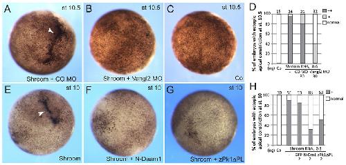 Fig. 4. Interference with the PCP pathway prevents Shroom-induced apical constriction. Early embryos were animally injected with FLAG-Shroom RNA (50â pg) and other RNAs or MOs as indicated. (A-D) Vangl2 depletion inhibits Shroom-dependent ectopic apical constriction (arrowhead). CO, control. (A-C) Representative embryo images at stage (st) 10.5. (D) Quantification of the data, numbers of embryos with strong, mild and no ectopic constriction are presented. Strong (++) apical constriction involves hyperpigmentation and the accompanying tissue invagination, mild (+) constriction is frequently visible as diffuse hyperpigmentation in the absence of tissue indentation. (E-H) Inhibitory effects of N-Daam1 and zPk1δPL on Shroom-dependent apical constriction in stage 10 embryos. (H) Quantification of the data. +indicates ectopic apical constriction; ânormalâ indicates no constriction. |