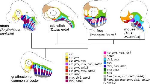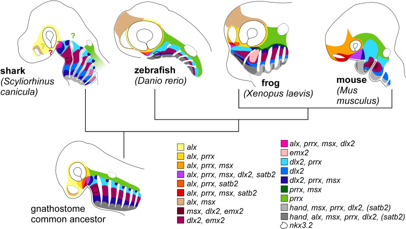 Fig. 4. Expression maps of larval gnathostome head skeletons. Combinatorial transcription factor expressions mapped to the head of a representative shark (Scyliorhinus canicula), ray-finned fish (zebrafish; Danio rerio), frog (Xenopus laevis), and mouse (Mus musculus). All schemes are depicted with anterior to left. Data for the shark, fish, and mouse were taken from current literature (see main text for citations); these maps represent our interpretation of published expression data. Extrapolating from these four organisms, we have reconstructed a hypothetical expression map for the gnathostome common ancestor. nkx3.2 expression in PA1 is uniquely indicated by a black outline. Colored question marks on the shark indicate our prediction of correspondingly colored expression domains which may be present in the shark head. satb2 in parentheses indicates a lack of this data in shark only (in both light and dark grey domains). pou3f3, gsc, and tbx2/3 were excluded from this map for simplicity. |