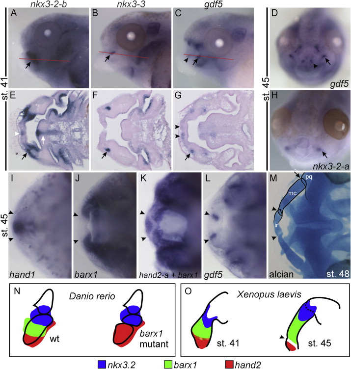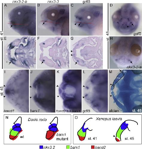 Fig. 6. Gene expression in the intramandibular and primary jaw joint. Lateral views (AâC), dorsal views (IâM), and sections (EâG) are all shown with anterior to the left. Anterior views in (D and H). All black arrows mark the primary jaw joint, and all black arrowheads mark the intramandibular joint. (AâC) lateral views of whole-mount ISH for (A) nkx3-2-b, (B) nkx3-3, and (C) gdf5 at st. 41. Red lines depict the plane of section in the corresponding panel below each whole-mount photo, black arrows mark the future primary jaw joint, and the black arrowhead marks the future intramandibular joint. (D) Anterior view of whole-mount ISH for gdf5 at st. 45. (EâG) Sections of st. 41 larvae showing expressions in the future intramandibular and primary jaw joints. (E) nkx3-2-b is expressed in a broad domain surrounding the nascent primary jaw joint (black arrow), and also medially in the future infrarostral (white arrowhead) and future basihyal (white arrow). (F) nkx3-3 expression is found in the primary jaw joint (black arrow). (G) gdf5 expression is found in the nascent intramandibular joints (black arrowheads), and primary jaw joint (black arrow). (H) st. 45 whole-mount ISH for nkx3-2-a, shows expression in the primary jaw joint (black arrow). (IâL) dorsal views of st. 45 whole-mount ISH showing mandibular expression of (I) hand1, (J) barx1, (K) hand2-a+barx1 (double ISH; see Methods section), and (L) gdf5. Black arrowheads mark the future intramandibular joints. (M) Dorsal view with a ventral focal plane of a st. 48 X. laevis larva stained with alcian blue. Black arrowheads mark the intramandibular joints, black arrow marks the right primary jaw joint. (N and O) schematics of expressions showing hand2 (red), barx1 (green), and nkx3.2 (blue) in the mandibular arch. (N) wt and barx1 mutant zebrafish mandibular expression (adapted from Fig. 9B of Nichols et al., 2013). (O) st. 41 and st. 45 X. laevis mandible expression. The barx1 mutant zebrafish takes on a larval morphology strikingly similar to that of an anuran, with an extra joint forming within Meckelâs cartilage. Black arrowhead indicates the position of the future intramandibular joint. ir, infrarostral; mc, Meckelâs cartilage; pq, palatoquadrate. |