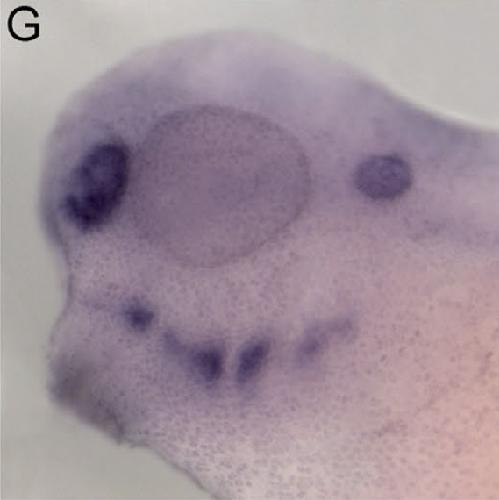 alx4 (ALX homeobox 4) gene expression in Xenopus laevis embryo, assayed via in situ hybridization, NF stage 34, lateral view, anterior left, dorsal up. |