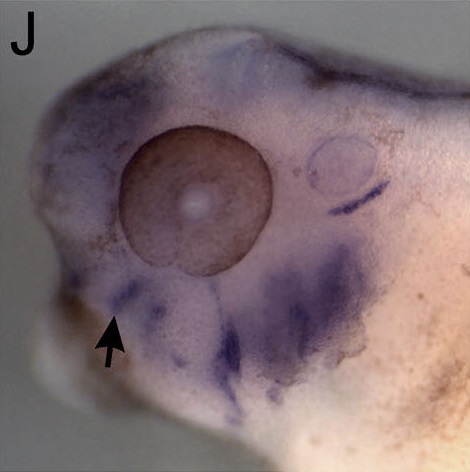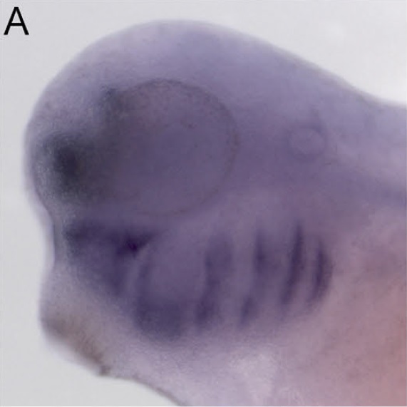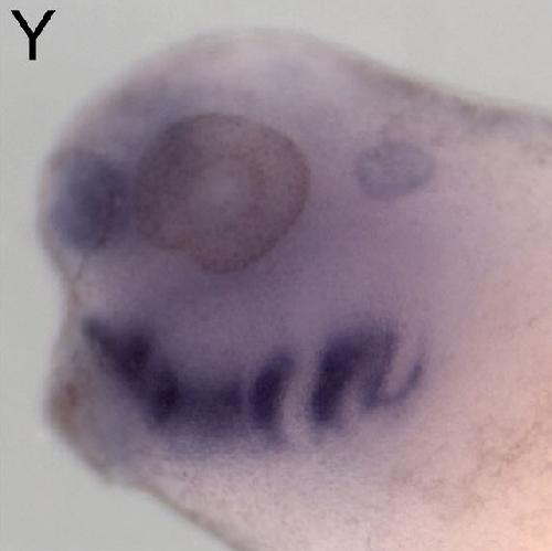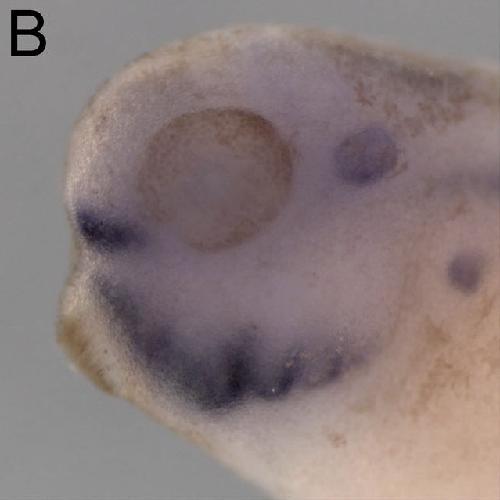 dlx4(distal-less homeobox 4) gene expression in Xenopus laevis embryo, assayed via in situ hybridization, NF stage 34, lateral view, anterior left, dorsal up. |