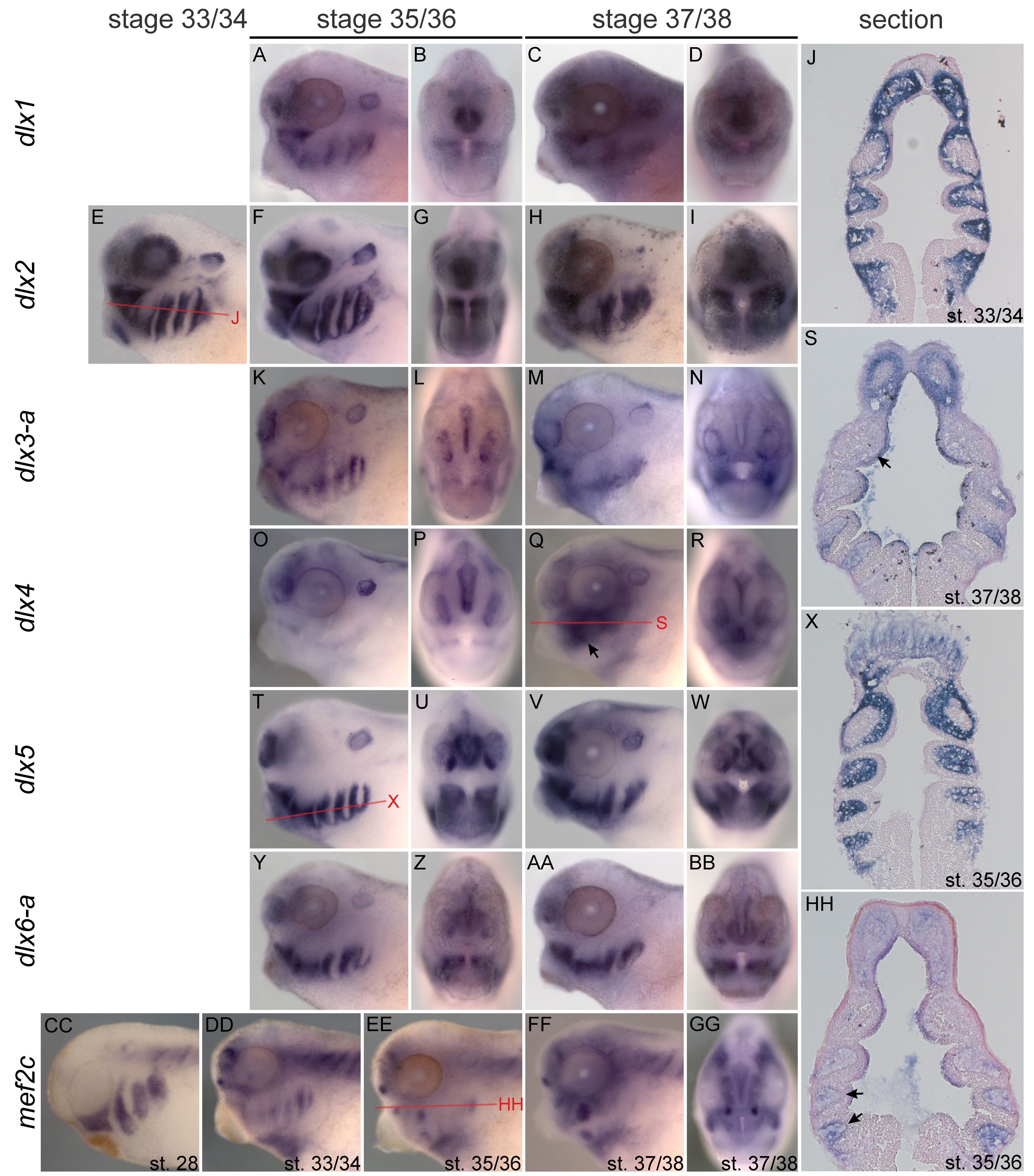 Expression of dlx genes and mef2c. Gene and stage are indicated in figure. Anterior to left in all lateral views, anterior to top in all sections. For those genes with a section shown, the plane of section is shown as a red line on the corresponding whole-mount panel. (Q) at stage 37/38, the dlx4 signal in the pharynx is mostly due to riboprobe trapping (arrows in Q and S), though some expression in the posterior arch CNCCs remains. (HH) expression of mef2c is detected in pharyngeal CNCCs (arrows). |