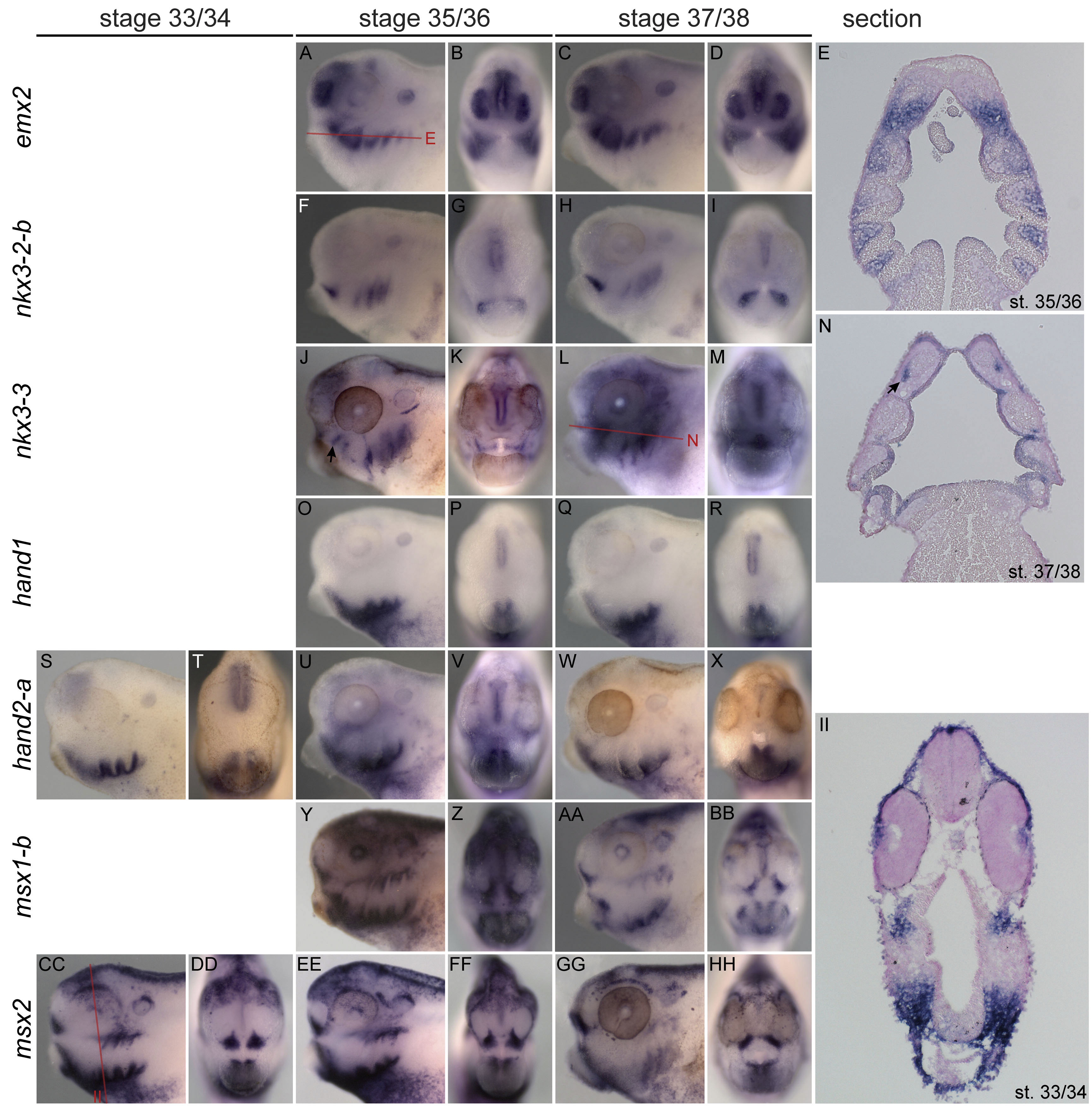 Expression of emx2, nkx3-2-b, nkx3-3, hand1, hand2-a msx1-b, and msx2. Gene and stage are indicated in figure. Anterior to left in all lateral views, anterior to top in E, N, dorsal to top in II. For those genes with a section shown, the plane of section is shown as a red line on the corresponding whole-mount panel. (J and N) nkx3-3 is expressed in CNCCs where the primary jaw joint will eventually form (arrow). |