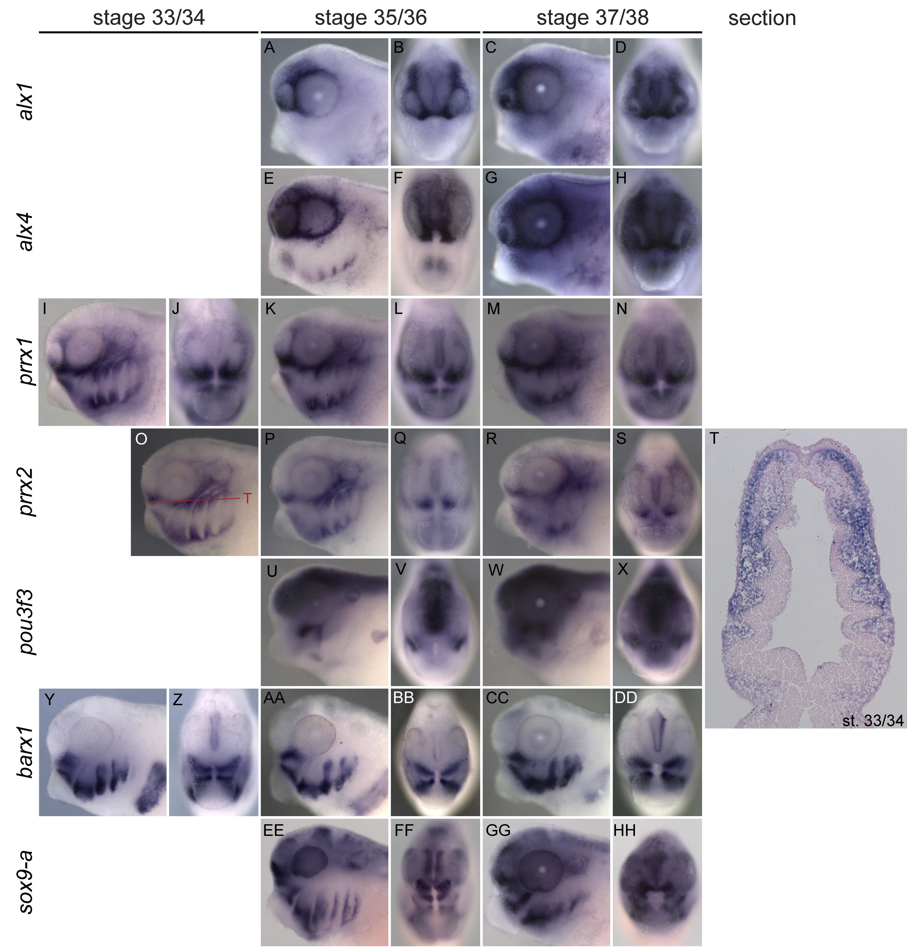 Expression of alx1, alx4, prrx1, prrx2, pou3f3, barx1, and sox9-a. Gene and stage are indicated in figure. Anterior to left in all lateral views. Red line in (O) shows plane of section in (T). |