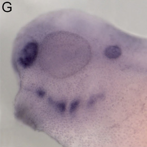 Fig. 3. Expression domains in the forming suprarostral plate, ethmoid plate, and trabecular cartilages at st. 37/38. Anterior to left in all panels. (A) Whole-mount lateral view of satb2 at st. 37/38; red line depicts the approximate plane of section used to assess gene expression in all subsequent panels. (B) satb2 is expressed dorsal to the PAs in the suprarostral plate at st. 37/38. (C) alx4 marks all aspects of the future neurocramium ventral to the eyes and brain. (D) prrx2 is found only in a lateral subset of the suprarostal plate, ethmoid plate, and trabeculae. (E) gsc-b is detected in the trabeculae and a small portion of the lateral ethmoid plate. (F) msx1-b is expressed strongly in the future suprarotal plate. (G) A summary scheme of the expressions shown in (B)â(F). |