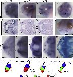 Fig. 1. dlx Expression in X. laevis at st. 33/34. Lateral views with anterior to left (A, C, E, G, I and K) and anterior views (B, D, F, H, J and L) of larvae stained by ISH for (A and B) dlx1, (C and D) dlx2, (E and F) dlx3-a, (G and H) dlx4, (I and J) dlx5, and (K and L) dlx6-a. The position of the stomodeum is indicated by an oval in all anterior views. (MâP) Schematic of dlx expression in the X. laevis (M and N) and mouse (O and P) cranial neural crest cells. See figure for key. Lateral views in (M) and (O), anterior views in (N) and (P). For X. laevis, the ventral blue domain is shown with grey stripes to indicate the expression of dlx3 in this region weakly. For mouse, data were used from both Jeong et al., 2008 and Depew et al., 2002. cg, cement gland; np, nasal placode; op, otic placode; st, stomodeum. Each PA is labeled by number. |