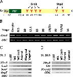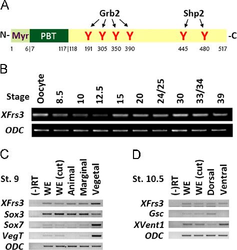 Temporal expression patterns of XFrs3. (A) Schematic representation of the domain structure of XFrs3. Six putative tyrosine phosphorylation sites (Y191, 305, 350, 398, 445, and 480) are marked in red. Myr, myristoylation sequence (MGSCCS, amino acids 1-6); PTB, phosphotyrosine binding domain (aa 7-117); Grb2, putative Grb2-binding sites; Shp2, putative Shp2-binding sites. (B) Levels of XFrs3 transcript are analyzed by RT-PCR using RNA isolated from whole embryos at indicated stages. ODC is used as a loading control. (C, D) Spatial expression patterns of XFrs3 in mid-blastula (C, stage 9) and early gastrula (D, stage 10.5) are analyzed by RT-PCR. Embryos were dissected to animal, marginal and vegetal regions at stage 9, or bisected to dorsal and ventral regions at stage 10.5. WE indicates RNA from whole embryos, and WE (cut) indicates RNA isolated with all dissected regions combined. Levels of marker gene mRNA for each region are examined to access the accuracy of dissection: Sox3, animal region marker; Sox7 and VegT, vegetal region markers; Gsc, dorsal marker; Xvent1, ventral marker. For the negative control of RT-PCR (âRT), RNA from whole embryos was processed as others without reverse transcriptase. |