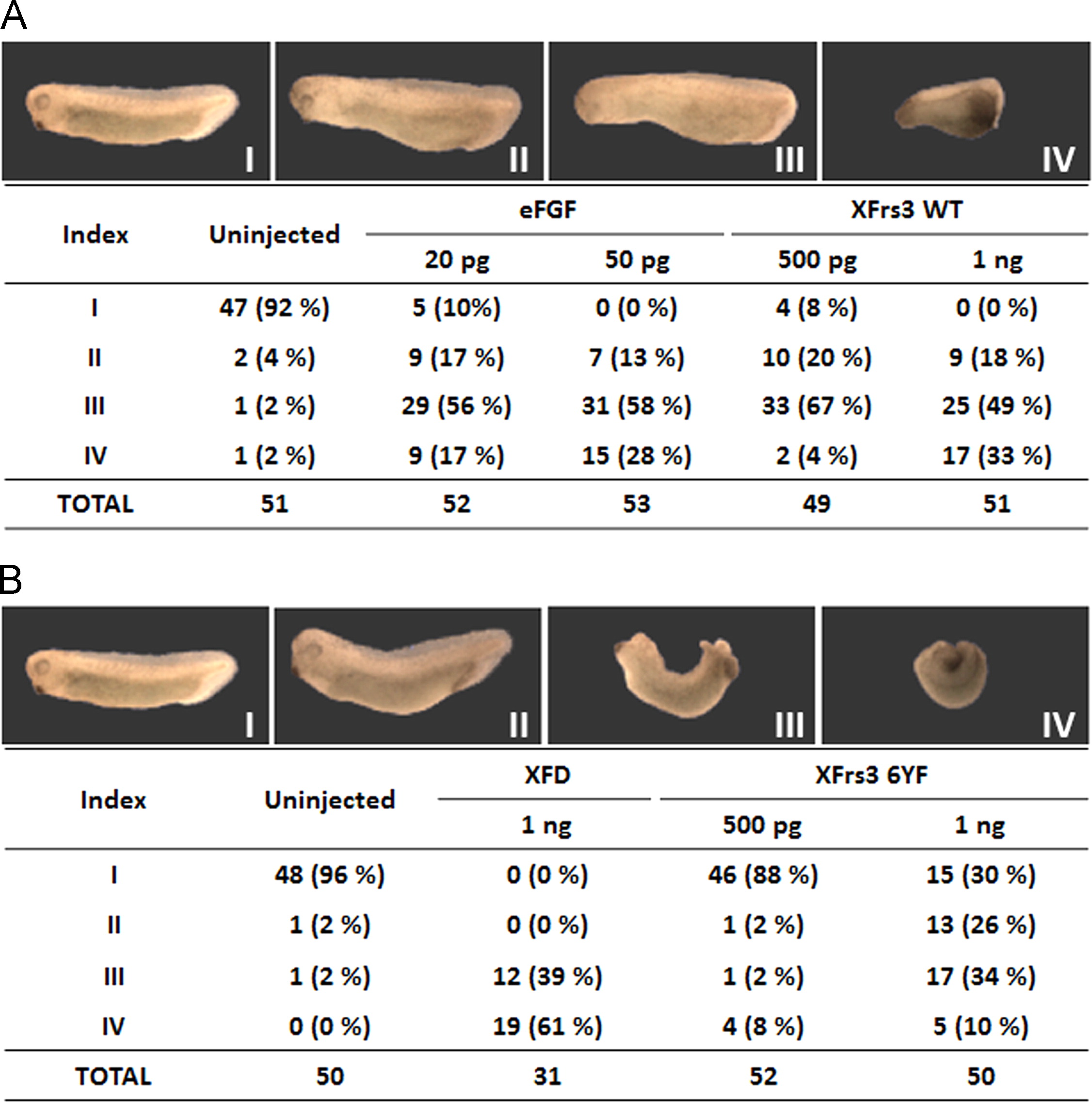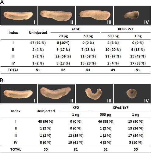 Fig. 3. Overexpression of wild type or mutant XFrs3 disrupts mesoderm patterning. Indicated amounts of mRNA (per embryo) were injected into equatorial region of 2-cell embryos, and the embryos are scored for phenotypes at stage 33/34. XFrs3 WT, wild type XFrs3; XFrs3-6YF, mutant XFrs3 with Tyr to Phe substitution for all 6 putative tyrosine phosphorylation sites; XFD, dominant negative mutant form of XFGFR1. Anterior is to the left. In the tables, numbers and numbers in parentheses respectively indicate the number of embryos and the percentage of embryos showing particular defect. (A) Indexes I-IV represent the degrees of anterior defects: normal (I) to most severe anterior defects (IV). (B) Indexes I-IV represent the degrees of posterior defects: normal (I) to most severe posterior defects (IV). |