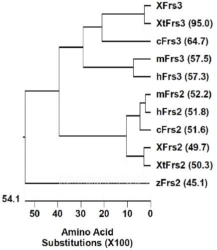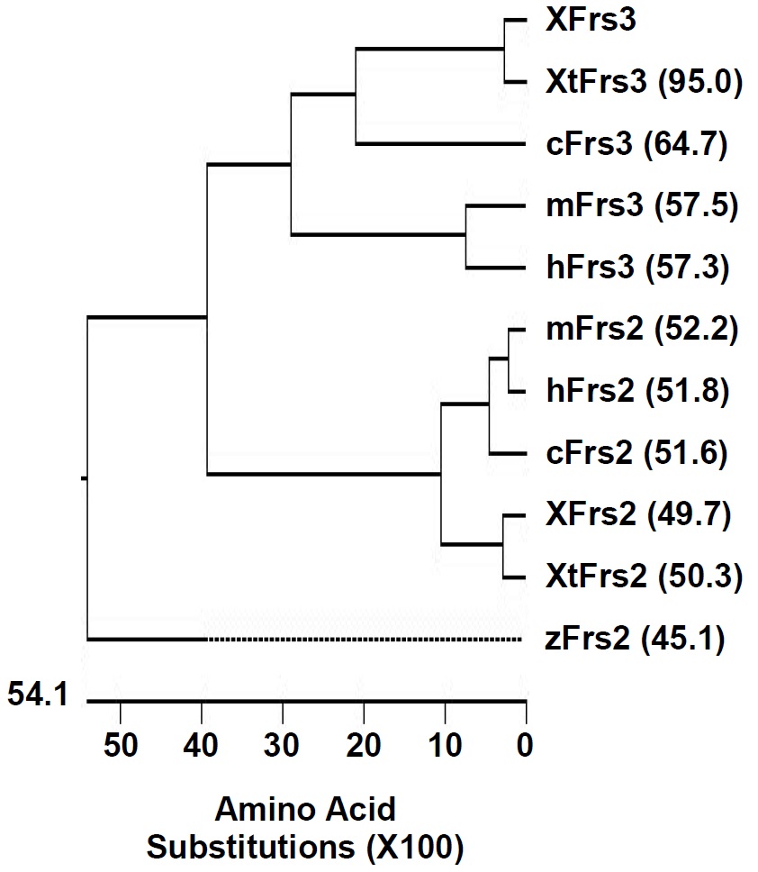 Supplement Fig. 2. Phylogenetic tree of vertebrate Frs homologs based on amino acid sequences: Xenopus laevis (X), Xenopus tropicalis (Xt), human (h), mouse (m), chick (c), and zebrafish (z). Numbers in parentheses are percentage identity with XFrs3. |